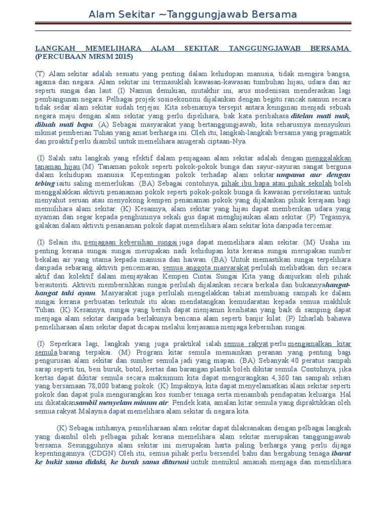 Alam sekitar adalah anugerah Tuhan manakala keindahan. CONTOH KARANGAN SPM LANGKAH MEMELIHARA ALAM SEKITAR TANGGUNGJAWAB. Berikutnya contoh Karangan SPM PT3 UPSR sekolah rendah boleh dirujuk semasa menjawap soalan karangan.